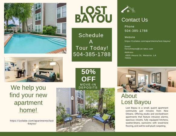 Stop by and see this charming community for yourself. We promise you'll be happy you did. Interested in leasing? Apply now! Download application (Copy and paste to your web browser): https://1stlake.com/apartments/lost-bayou/
