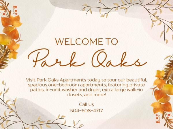 If you’re searching for a spacious apartment home, Park Oaks is a must-see in Metairie, LA! Call TODAY: Enjoy comfortable living in a peaceful, park-like setting with: • Large Closets • Bright Bay...