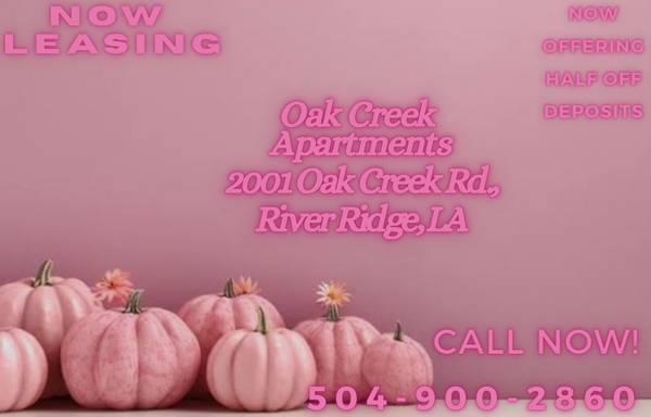 Sit back and imagine the luxury of living in an elegant apartment home located within The Creeks of River Ridge, a gated garden community just minutes from work and play. Oak Creek Apartments is conveniently located to Downtown New Orleans, Elmwood Business Park, the Earhart Expressway, Huey P. Long Bridge, and Interstate-10. Our location is also ideal for individuals attending local area universities such as Tulane, Loyola and Xavier.