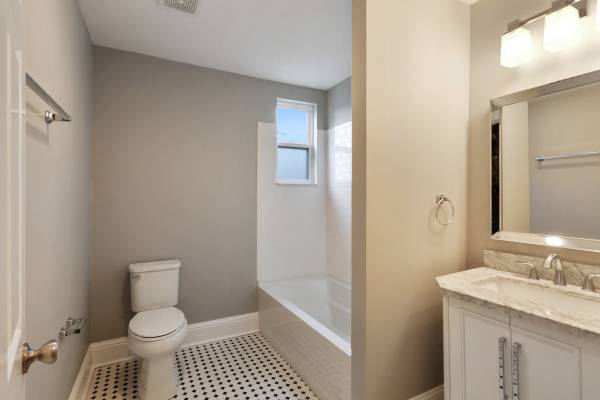 The rear of the unit features 3 independent bedrooms and 2 full bathrooms. One of the bedrooms is a primary, which features its own private bathroom. All of the bedrooms have recessed lighting and a ceiling fan. The bathroom have a marble top vanity, subway tile surround in the shower/tub, and a classic New Orleans ceramic tile for flooring.