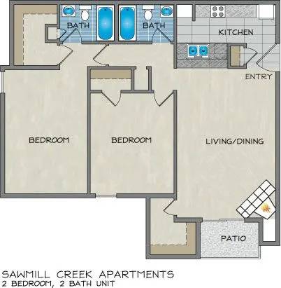 At Sawmill Creek your own private wooded environment beckons you home to resort style living. Enchanting pools, grilling stations and outdoor fitness facility and playground promote an active lifestyle. Once you come inside our gated community, you are welcomed by serene environment showcasing natural beauty. If you are looking for an apartment for rent in River Ridge, come experience the warm, inviting atmosphere created by wood burning fireplaces, vaulted ceilings and private patios or balconies.