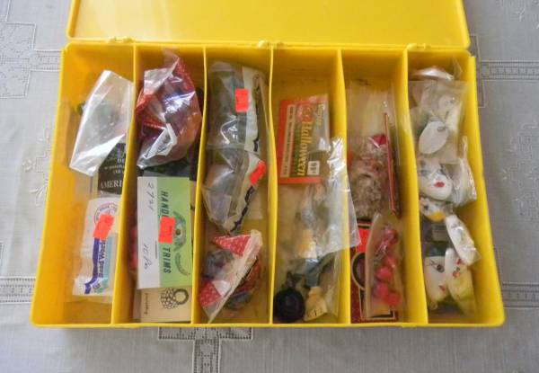 Selling a lot of vintage craft supplies and the plastic box in which they have been stored for many years. These probably date from the 1980s or so.
