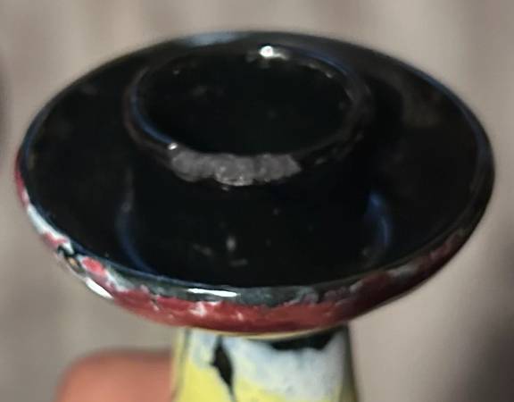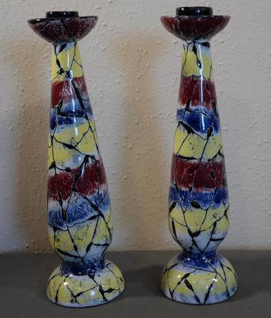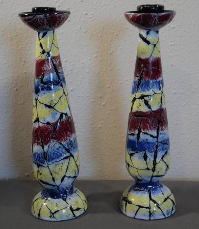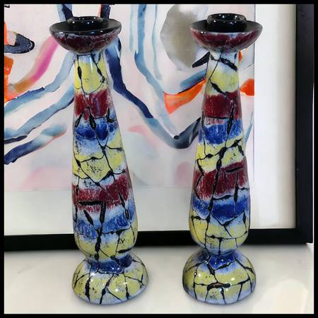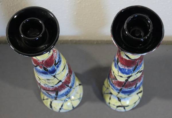 Add a pop of color to your home decor with this pair of quirky, crackle-finish candlesticks from 1960's Italy featuring lovely hues of red, blue, yellow, white, and black. Their unique design and European art influence make these candlesticks a standout addition to any modern space.
