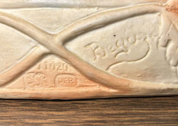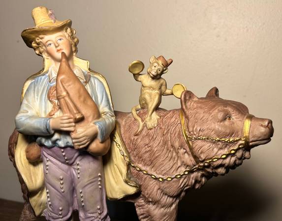 Up for sale is a Circa 1930 German Scheibe-Alsbach Kister Bisque Porcelain Man with Bagpipes/Monkey with Cymbals Atop Grizzly Bear Figural Group! It appears to be signed by the modeler “Begur”. It measures 10 7/16” tall, 9” wide, and 4 1/4” deep. The piece is in excellent overall condition with minor signs of wear consistent with its age and use (some light wear to edge of feather on man’s hat (see pic)). Please message us if you have any questions. Thanks!