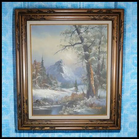 Up for sale is a Vintage Circa 1970 Snow Covered Mountain Forest Landscape Framed Oil Painting on Canvas by L. Harding! It measures 27 7/8" by 31 3/4" on the outside of the frame. The piece is in excellent overall condition with minor signs of wear consistent with its age and use (some scattered light surface wear). Please message us if you have any questions. Thanks!