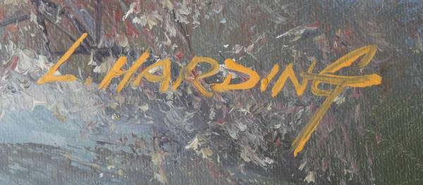Transport yourself to a serene winter wonderland with this vintage landscape painting by L. Harding. The snow-covered mountains and forest come to life in vivid oil colors, framed in a stunning carved wooden frame. Expertly executed, this piece will add a touch of beauty and nostalgia to any room.