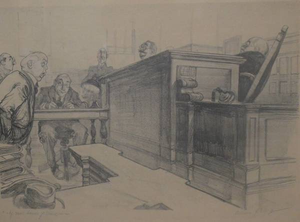 Add a touch of vintage charm to your walls with this signed lithograph print by William Sharp. Depicting a lawyer and judge in a courtroom, this American piece from circa 1950 is a great addition to any art collection. Add this lovely artistic gem to your decor today!
