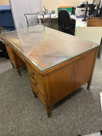 Wooden office desk for sale with glass top and 6 drawers. In great condition. Would need to pick up from office building in Metairie.