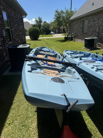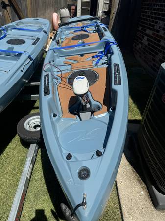 Both Kayaks are in great condition one is factory and the other has some upgrades (matting on the bottom, a removable trolling motor, and an additional bar on the back to insert wheels for easier launch). See link for the price of one of these brand new :