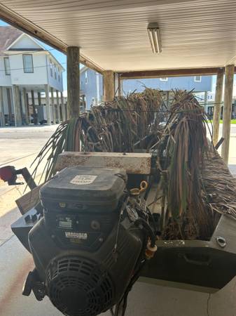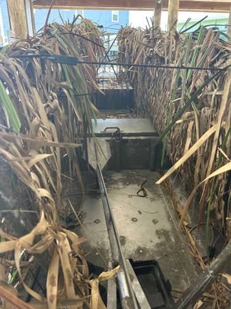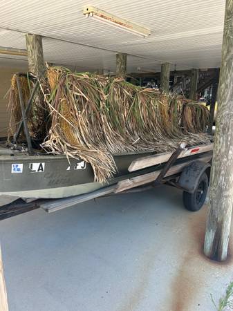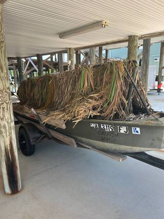Hull 2003(cleared out foam in rear for more space, Custom fabrication aluminum gas tank up against front( takes up no space). Go Devil in Baton Rouge replace the frame in 2013, and they put on a new motor in 2014( have paperwork from go-devil in Baton Rouge). Gator glide on bottom of hull. Bought the blind from go Devil in 2022 and installed on Boat. Was only used to tow behind my flat Boat to Hunt the Biloxi wildlife management area. So I only tow the go Devil rig and used it to just putt into the ponds and hunt with my daughter, and then tow it back to my Camp with the flat Boat. My daughter is now older and not interested in hunting with me, and on top of that they’re no longer allowed on the Biloxi Wildlife management area and I have no need for the boat. I have probably used this rig 15/20 times, and each Hunt probably only put 5 to 10 minutes on it running other than that it was towed.