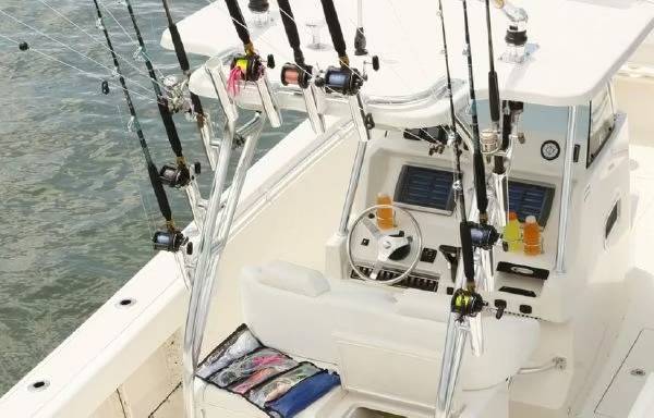 Fiberglass Hardtop with 12 rod holders, Rupp Outriggers, and LED lighting.