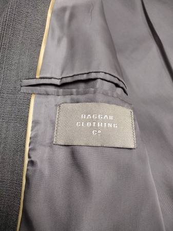 Approximately 44 long size, for someone 6 ft to 6'2, 175 lb to 225 lb, sort of a grayish greenish taupe neutral color. Looks new. Good brand (Hagger). The few wrinkles on it will come out. Possible delivery between Saint Bernard and Metairie within a week.