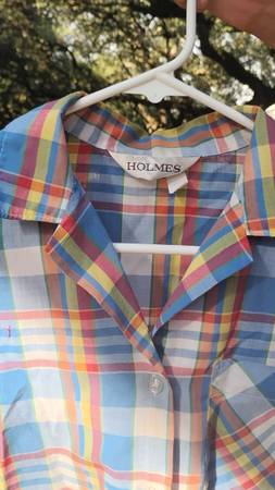 This vintage blouse is size small -medium. My guess is it's anywhere from the 1950's -1970's... I found it in the men's section at good will. The tag says Holmes which I presume refers to D.H.Holmes but it is vintage none the less. I just want my money back.