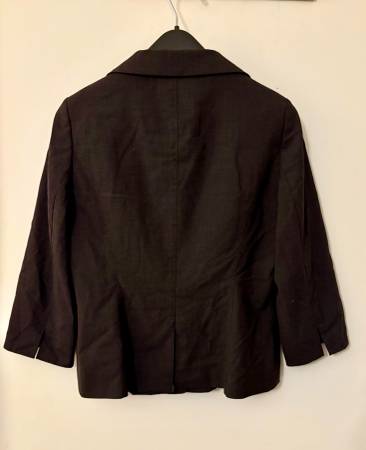 Ann Taylor black, 3/4 sleeve, 3 button blazer in size 8, Shell is 95% Wool, 5% Spandex, Lining is 95% Polyester, 5% Spandex. Dry Clean only, do not steam clean.