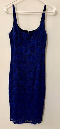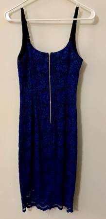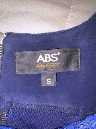 Almost electric blue lace, adjustable spaghetti straps, mini dress by ABS Allen Schwartz in size small. Back has zipper. Body is 58% Nylon, 37% Rayon, 5% Spandex. Lining is 92% Polyester, 8%...