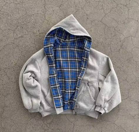 Simple dark grey zip up with a blue plaid inside, nothing crazy. Size medium and no major issues Will ship as soon as possible