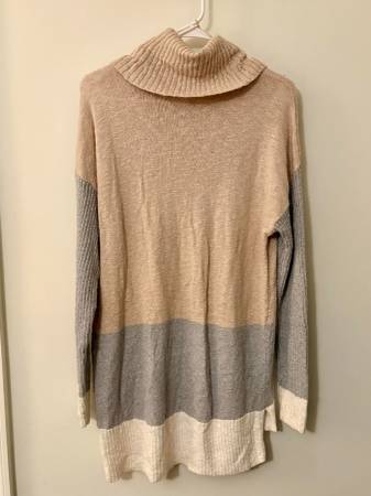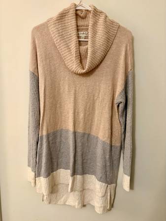 Wonderly Cowl Neck long sleeved sweater in tan, grey and beige color block. Size M. Small stain on one of the sleeves. Sold as is. Please check the pictures provided.