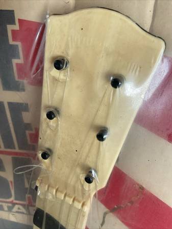 Overall, excellent unused condition and sealed on the original generic Lapin Made in USA card. Heavy cardboard card is bowed around the guitar, which is typical of this type of seal. Some tearing to the seal at bottom and bottom left but seal is still quite intact and tight. Some other minor tearing to seal around edges. Again, seal is tight and intact. This is a larger item and measures approx 30 x 13 inches.