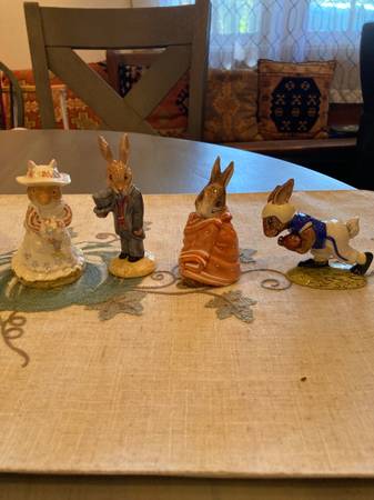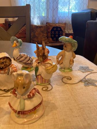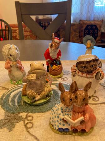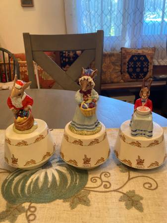 Assortment of nine Beswick Beatrix Potter figurines and five Royal Dalton Bunnykins figurines, plus three Bunnykins music boxes. May consider a lesser price for groupings. Call for information...