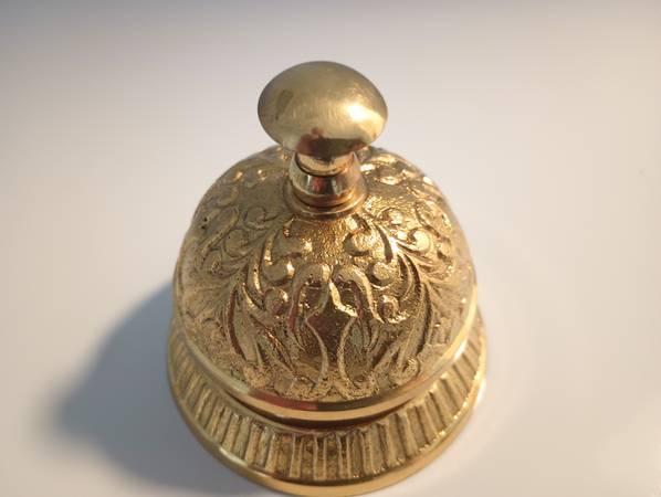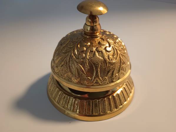 2) BEAUTIFULLY DESIGNED WORKING SOLID GOLD BRASS TYPE BELL THE RINGS WITH CLARITY. (ROYAL) $30.00