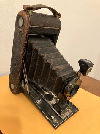 Very old Autographic Kodak camera. Ball Bearing shutter. 4" x 8". Patented 1/1910 & 1/1913. All black leather case. Needs leather repair inside. $40. Cash only.