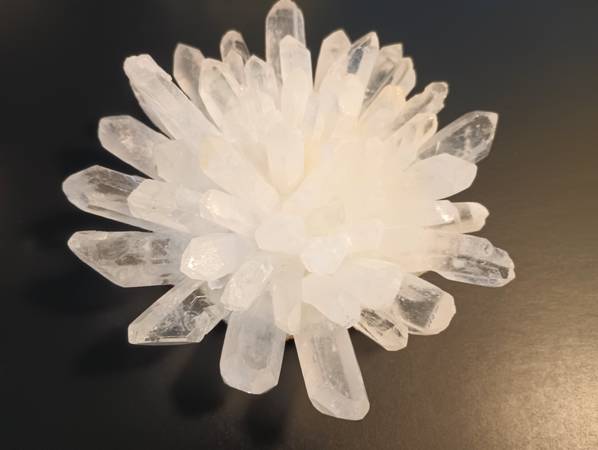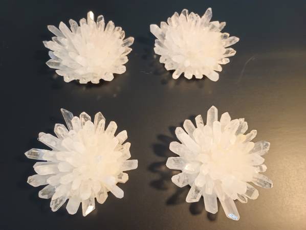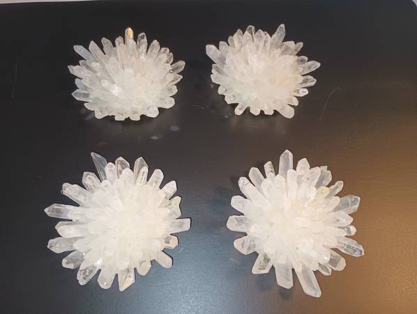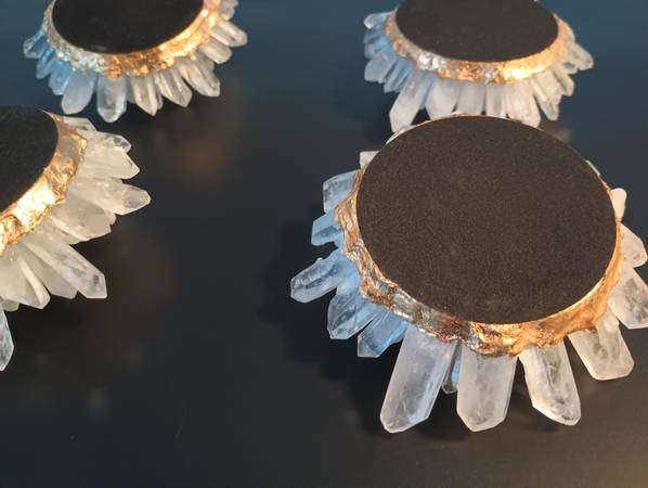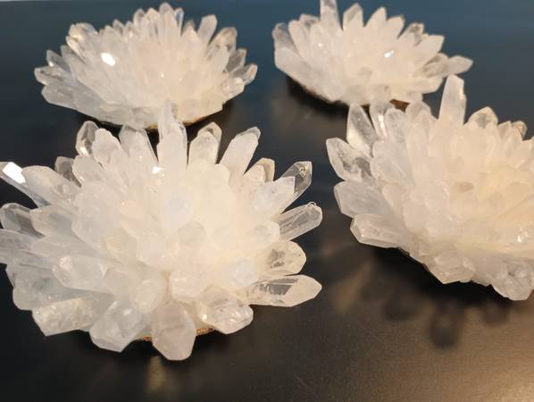 BRAND NEW LOVELY GENUINE CLEAR QUARTZ CRYSTAL FLOWERS MADE IN BRAZIL GOLD TRIM , VELVET BOTTOM TO PREVENT SCRATCHING FURNITURE GREAT GIFT FOR THE WIFE, AS WELL AS THE FUTURE WIFE. ONLY 4 IN STOCK....