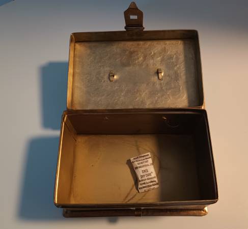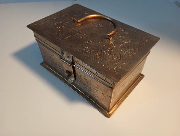 BEAUTIFULLY CRAFTED SOLID BRASS DETAILED ETCHED DESIGNED LOCK BOX WITH HANDLE FROM INDIA. $35.00 7 1/4" WIDTH 6 " HEIGHT 4 3/4" DEPTH UNUSED WITH DRY PACK STILL INSERTED IN BOX