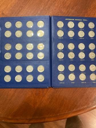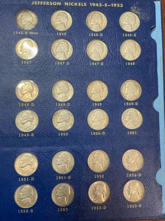 Complete Jefferson nickel set 1938 through 1965 including all silver war nickels. The 11 silver nickels are worth $35 by themselves. Some of these silver war nickels are uncirculated. This set has 72 coins. Also included is the key date 1950 D. Some coins are brilliant uncirculated. this would make an excellent Christmas present for someone wanting to get started collecting coins. The set is enclosed in a blue Whitman book.