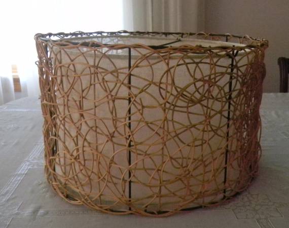 Selling a cool looking lampshade with a mid century modern vibe. It measures 16 inches across by 10 inches tall. The lamp shade has two outer layers. There is a canvas type material over which is another layer consisting of curved and intricately woven pieces of wood. See photos. Nice used condition.