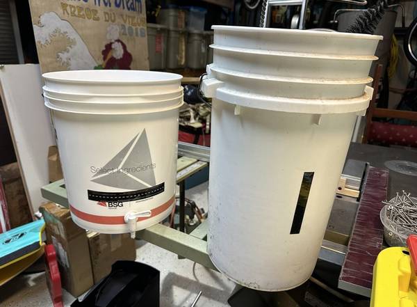 Assortment of home brew equipment includes two fermentation buckets, corker, 2 bottle capers, 2 hygrometers, filling siphon, 4 bubblers, 3 carboy caps, carboy funnel, 1 carboy wash base, and 2 brushes. Maybe a few extra bits.