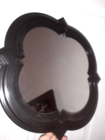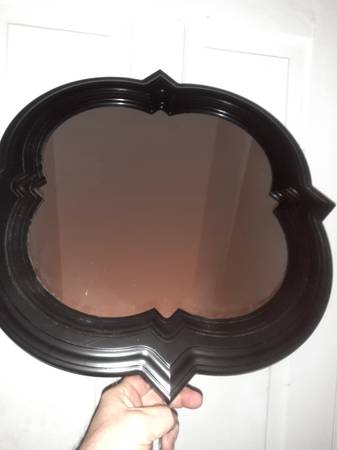Mirror is glass , frame is hard pleasti. Measures 21 in tall and wide. No voicemails please.