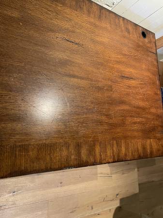 Aspenhome Desk + hutch Desk: depth: 28.5" , width: 48.5", height: 31.5" Hutch: depth: 14.3", width: 46.5", height: 34.5" (hutch: width at top is 48.5") Piece needs repair -- great project piece!...