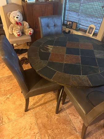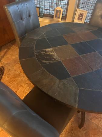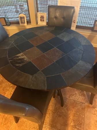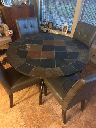 Excellent condition. Round slate top table with 5 matching chairs . . $150 Well made - like new