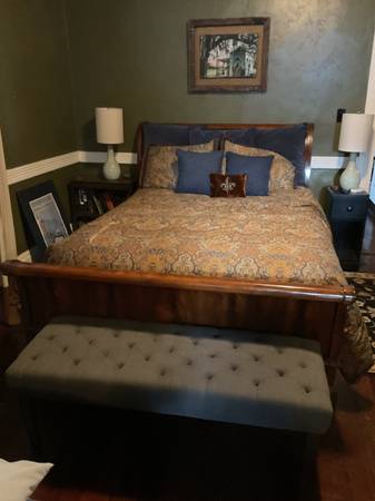 Like sleeping on a cloud, queen Sleigh bed with pillow top mattress also has an addition pillow top pad, comes with 3 sets of sheets Asking $650 Bed has always been in a cover. Used in guest room