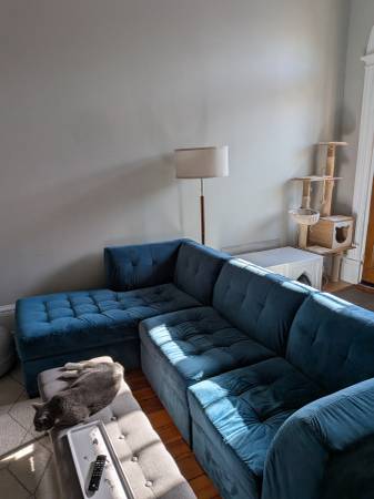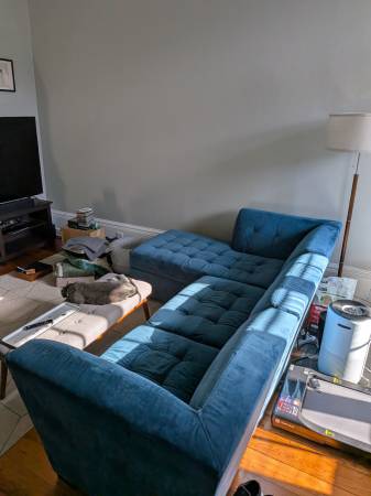 This is a very pretty teal (peacock) sectional from Macy's. It's 4 years old and in relatively good shape. No holes or rips or stains. It lives in a house with cats so it needs vacuumming. The material is like velvet but technically a microfiber. It's 3 pieces. It's not terribly heavy. No couchbed to contest with. You need to pick it up / move it. We aren't delivering it anywhere. We're in the Quarter and moving soon. The window for pick up will likely be weekday early evenings or lunch hours in the next week and a half.