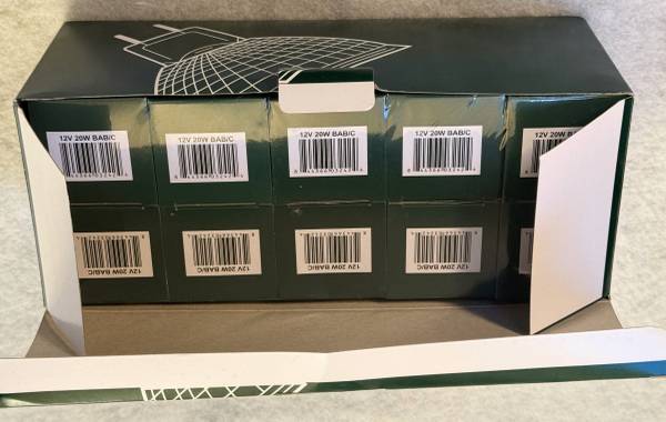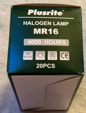 • Case of 20 “Plusrite” brand bulbs-MR16 X-life halogen bulbs, 20 watt, 12 volt – never opened or used - in original shrink-wrap packaging.