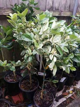 Fall and Winter is an ideal time to plant citrus trees. Pink Lemons have multi colored leaves and striped fruit. It is an Eureka variety. 1 year old in 5 gallon pots.