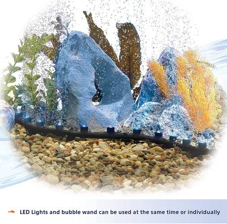 Create a decorative bubble curtain accented with LED lighting. The bubble wands come with suction cups that attach to the aquarium bottom and are made of flexible material that allows for shaping and bending around aquarium décor.