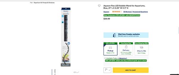 $25.00 FOR SET OF -Aqueon Flex LED Bubble Wand for Aquariums,Blue, 21" L X 2.25 AND Imagitarium Black Airline Tubing 8' Length