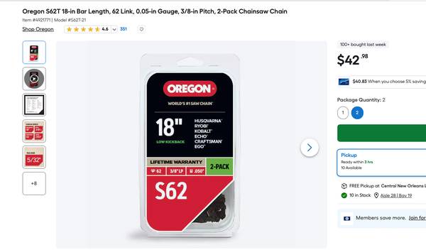 BRAND NEW Oregon S62T 18-in Bar Length, 62 Link, 0.05-in Gauge, 3/8-in Pitch, 2-Pack Chainsaw Chain LEAVE A MESSAGE AND I WILL RESPOND! THANK YOU FOR LOOKING!