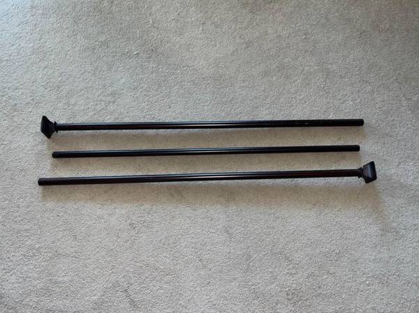 3 piece adjustable length brown metal 1.25 inch diameter curtain drapery rod with finials Adjustable from 106 inches to about 13 feet. End rods each measure 53 inches, center piece is 52 inches....