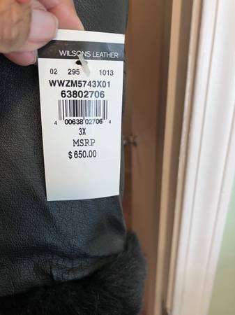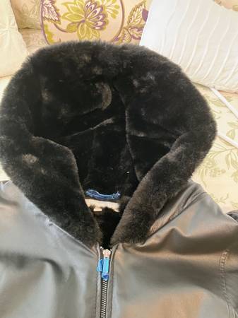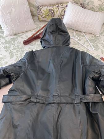 Beautiful ladies’ black hooded jacket faux fur lined with hood inside fur belted with Side pockets and fur trim around sleeves. The leather is super soft. This jacket is brand new never worn with the original tags in place. Paid 650.00 for it asking 350 size is a 3x
