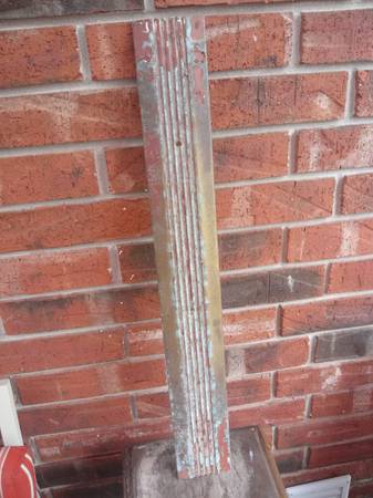 Solid brass. The first picture shows the underside of the threshold. Measures. 30 in. long. 4 in. wide. 3/8 thick. It isn't bent or damaged,just years of paint to be stripped away.