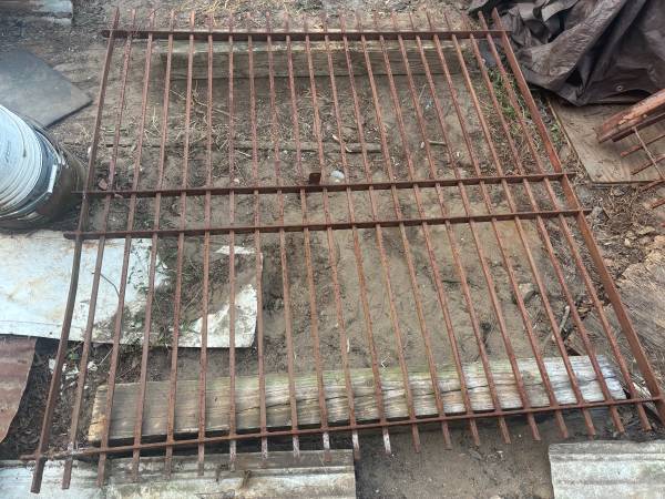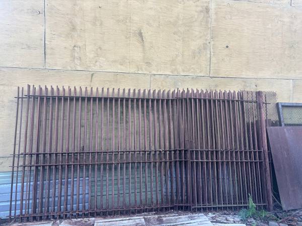 Eight panels of steel fencing with half inch pickets, grind pyramid tops pierced through four pieces flat bar. You could not buy the material and have it punched for the sale price. The old pain is flaking, which would be easy to pressure wash off ,light surface. rust no rust pitting.