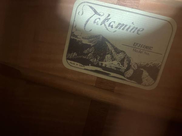 Real nice Takamine acoustic with cutaway. Built in pickup, 3 band graphic EQ, tuner. Looks and plays great. Comes W/O case.