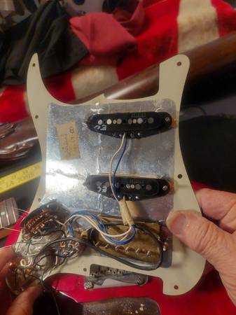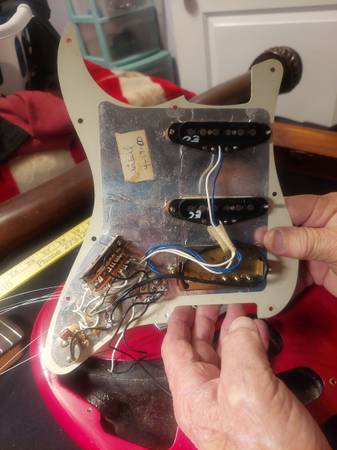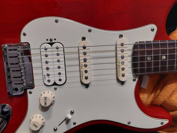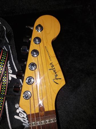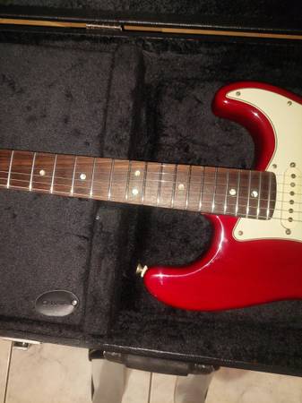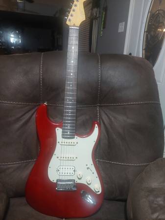 stratocaster in real good cond has all the deluxe plus features.I am putting photos in the ad for you to see what under the hood of this guitar.few minor battle scars but not any big ones hardly noticeable nice cond for a 25 year guitar.you can see the wood grain through its transparant crimson color.call me by phone ray show contact info