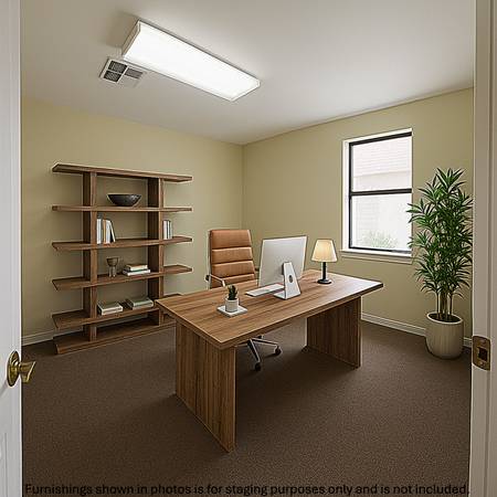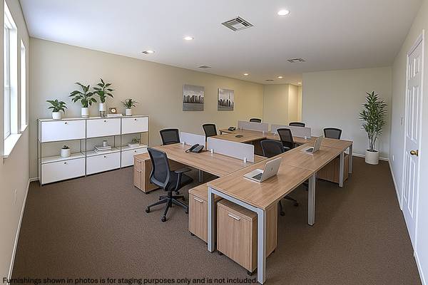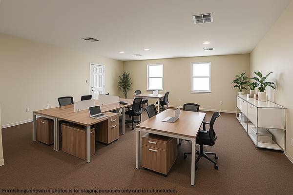 Please note that furnishings shown in photos is for staging purposes only and is not included. The office is currently unfurnished.