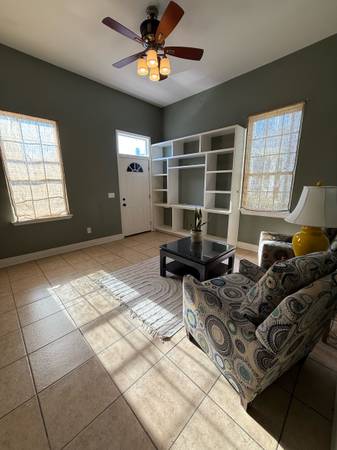 Three separate offices, unfurnished, or furnished for an additional fee, each with natural light, a common and furnished lobby, kitchen, and bathroom.