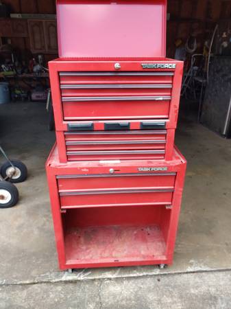 Task Force tool cabinets, used in working order and undamaged, cabinet is on wheels. has locking key.