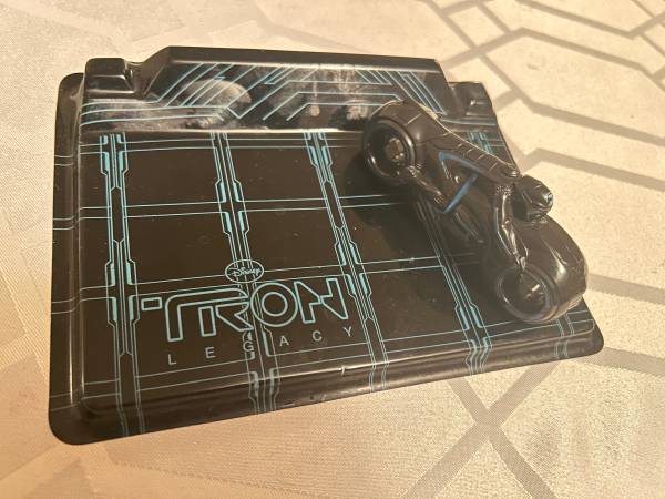 DISNEY'S Sam Flynn Light Cycle is made of plastic and is approx 4 inches long, and the Race Grid is approx 7 inches by 6 inches...this collectible toy can be used as a cake topper, displayed, or played with....the price is $12...please call show contact info